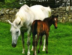 Her dam-sire is Java Tiger (photo right), a big grey racehorse who was known for his ability to sire competition horses, and for stamping his distinctive colour. Xas's sire was a racehorse called Captain Maverick who was bred in the United States. Although he was by the famous French stallion Nureyev, he himself was less successful on the racecourse, and ended up covering heavier mares to produce horses for show jumping and only the occasional racehorse. As Dummy Foal syndrome affects mostly thoroughbred foals, it was probably the narrow gene pool of Xas's lineage that is partly responsible for her problems at birth.
