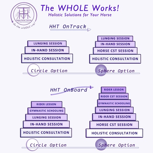 HHT OnTrack options do not include riding work, so are suitable for young horses not yet backed, rehab cases not yet ready for riding work, or for anyone who just wants to explore the first stages of the gymnastic process. HHT OnBoard options address the same foundations, but progressing to riding work in the form of both a schooling session where the horse is ridden by either Camille or myself, and a separate riding lesson for the client.